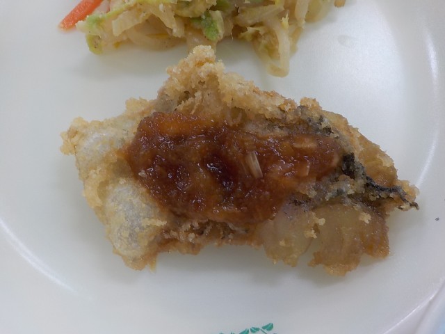 今日の魚は「スケトウダラ」です。スケトウダラは、とっても冷たくて深い海に住んでいます。タラの仲間ですが、タラよりも体が細くてスリムです。給食では今日のように身を食べることが多いですが、スーパーなどではかまぼこやちくわに変身して売られていることが多いです。今日はスケトウダラをからあげにして、上からおろしソースをかけました。おろしソースは、だいこんをすりおろして作っています。だいこんには、消化をたすけるはたらきがあります。つまり、体の中でたべものを細かくして、みなさんの栄養になるようにたすけてくれています。
