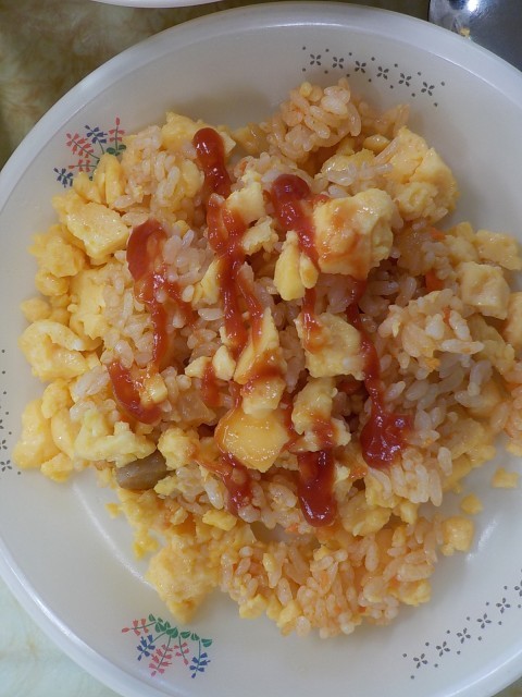 今日の給食 オムライス風ごはん だいこんの甘酢あえ 豆乳スープ 牛乳