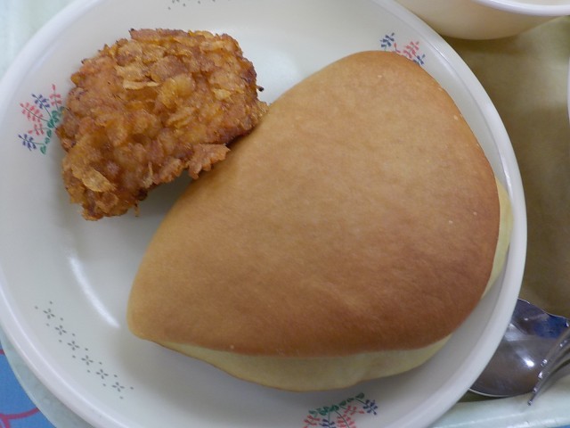 今日は「お楽しみ給食」です。『クリスピーチキン』の衣はなにがついているかわかりますか?答えは「コーンフレーク」です。ザクザクとした食感がポイントです。今日のパンには東京都でとれたはあしたばが練りこまれていて、2つ折りの形にしたパンなので、チキンをはさんで食べてもよいですね。今日のデザートは、手作りの『ベイクドチーズケーキ』です。クリームチーズや砂糖、生クリームなどを混ぜて、オーブンで焼いて作りました。