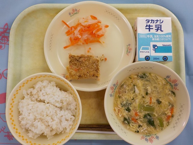 今日の給食 【おせち・七草献立】 麦ごはん 松風焼き 紅白なます 七草かきたま汁 牛乳