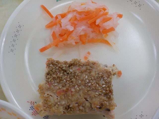 今日は「おせち・七草献立」です。おせちの中からは、『紅白なます』と『松風焼き』を出しました。紅白なますは、にんじんの赤とだいこんの白でおめでたい紅白にしています。松風焼きは