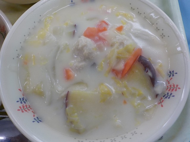 今日の給食 はちみつレモントースト ポパイサラダ 肉だんごとさつまいものクリーム煮 くだもの(みかん) 牛乳