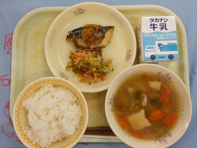 今日の給食 ごはん 魚のピリ辛ねぎだれ くきわかめのサラダ のっぺい汁 牛乳