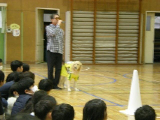 視覚障害者の生活と盲導犬の役割について知ろうという学習で、視覚障害者の方の外出や盲導犬の役割について学び、また歩行実演を行いました。