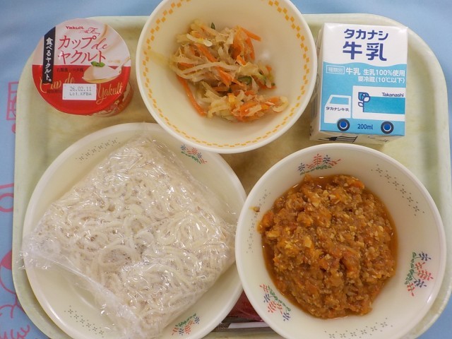 今日の給食 【学校給食週間②昭和中期の給食】 ソフト麺 ミートソース ツナと大根のサラダ ヨーグルト(カップdeヤクルト) 牛乳