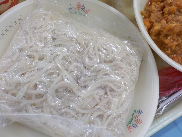 全国学校給食週間 2日目の今日は「昭和 中期の給食」で、『ソフトめん』を出しました。戦後、学校給食の主食はパンでしたが、昭和40年ころ、主食をふやすために開発されたと言われています。ソフトめんは正式には『ソフトスパゲッティ式めん』といい、強力粉と塩でできています。1食ずつ包装されていて、洋風と和風どちらにも合う便利な主食として、給食のめんといえば『ソフトめん』だったそうです。