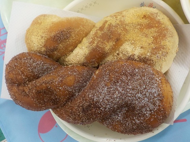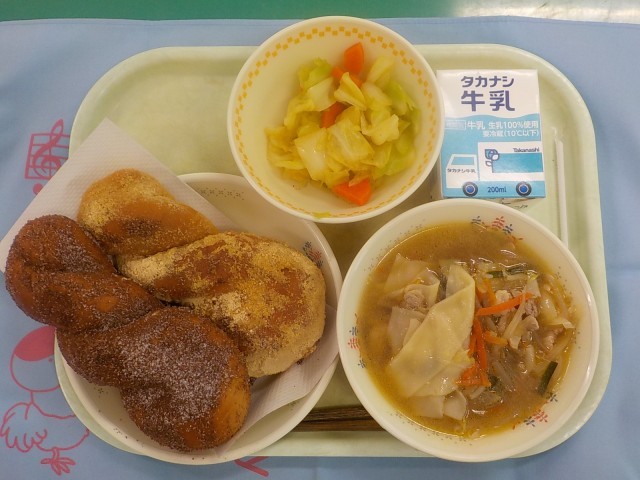 今日は揚げパンのセレクト給食です♪きなことココアの好きな方の味をえらびましたね。結果は、きなこが262人、ココアが242人でした。それぞれがえらんだものを味わって、楽しく食べましょう。揚げパンは、実は「給食生まれの人気メニュー」です。今から70年くらい前の食べものが少ない時期は、アメリカからおくられた小麦粉で作られたパンが給食の主食でした。パンも今のように やわらかくておいしいパンではなかったため、かたくなったパンをおいしく食べてもらうために、給食調理員さんが工夫してうまれたメニューが『揚げパン』です。