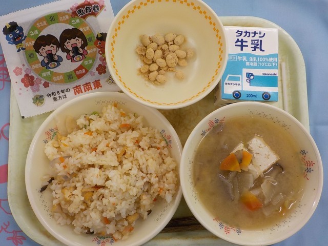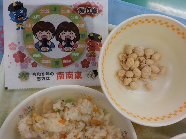 今日、2月3日は節分です。節分といえば「豆まき」ですね。大豆を「おには~外~、福は~内~」と言いながらまきます。これからの1年を健康にすごせますようにとお願いする行事です。そこで、今日は『きなこ豆』を出しました。また、最近では節分に『恵方巻き』を食べることも多くなってきましたね。恵方巻きは、その年の中で一番ラッキーな方角を向いて食べる、特別な太巻きのことです。最後まで一言もしゃべらずに食べられると「願い事がかなう」と言われています。今日はのりにちらしずしを自分で乗せて、くるくると巻いて食べください。