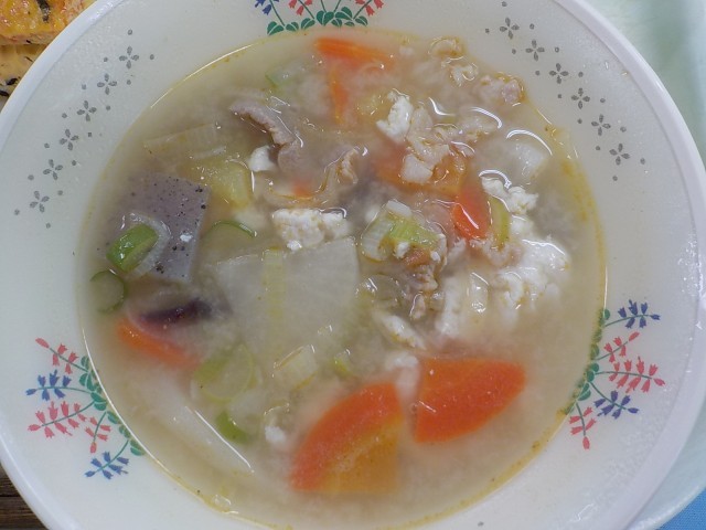 『吹雪汁』の「吹雪」とは、はげしい風とともにふる雪のことです。このあたりでは吹雪になることはほとんどありませんが、東北や北陸地方の人たちは今の時期、雪でとても大変そうですね。今日はそんな吹雪をイメージして汁ものを作りました。豆腐を細かくし、汁の中にちらして入れて、吹雪の様子をあらわしています。今日は比較的あたたかいですが、週末はまた寒くなると言われています。この汁を飲んで、冬の寒さを乗り切りましょう!