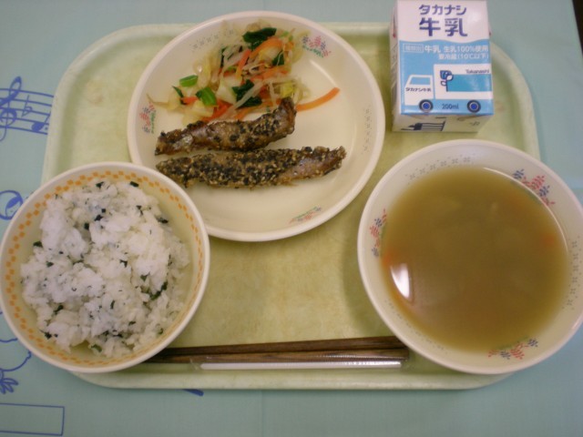 今日の給食 【めし‐1グランプリ:ごはん部門1位】 わかめごはん ししゃもの石垣揚げ からしあえ お事汁 牛乳