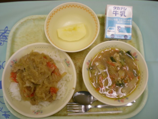 今日の給食 【6年生のリクエストメニュー:第10位】 おろしぶた丼 ワンタンスープ くだもの(りんご) 牛乳