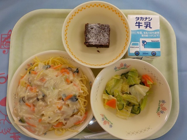 今日の給食 ホワイトソーススパゲッティ バジルサラダ 豆腐入りブラウニー 牛乳