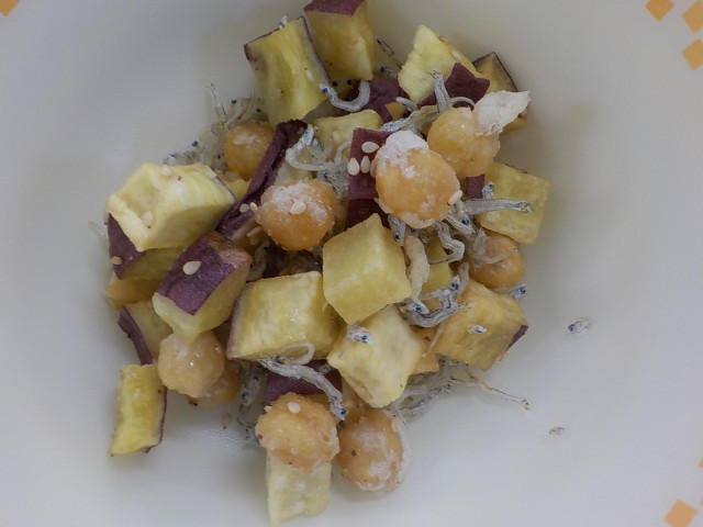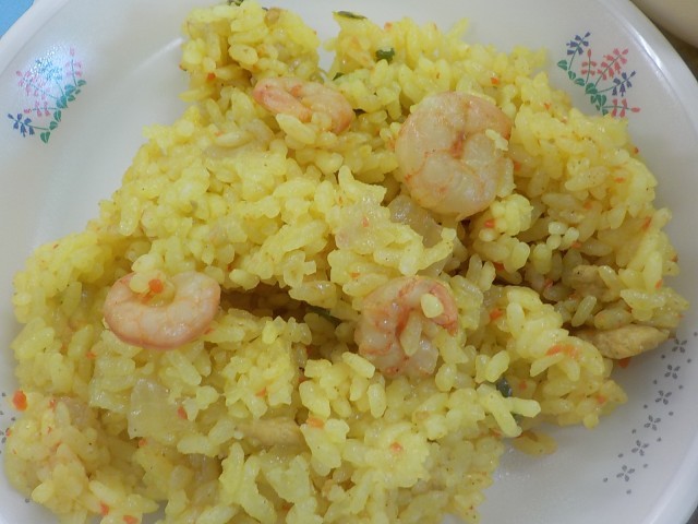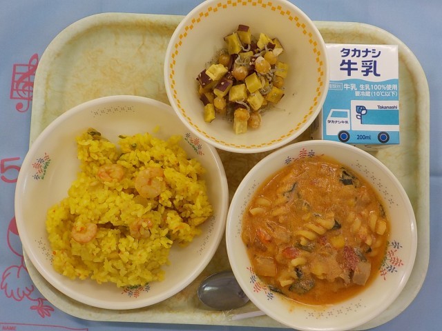 今日の給食 【町田の朝食レシピコンテスト~給食にもピッタリで賞】 スパイシーエビピラフ カリカリ揚げ トマトと豆乳のパスタスープ 牛乳