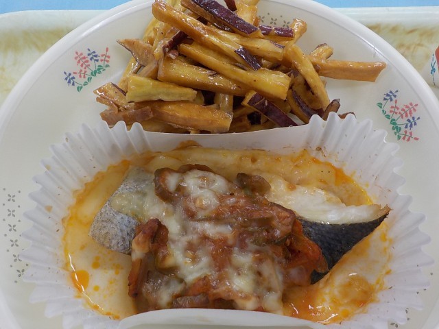 今日の給食 ごはん 魚のピザ風焼き さつまいもの塩けんぴ風 ジュリエンヌスープ 牛乳