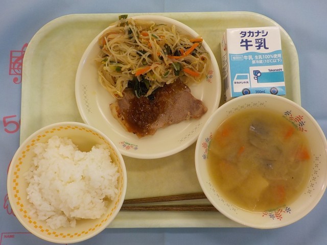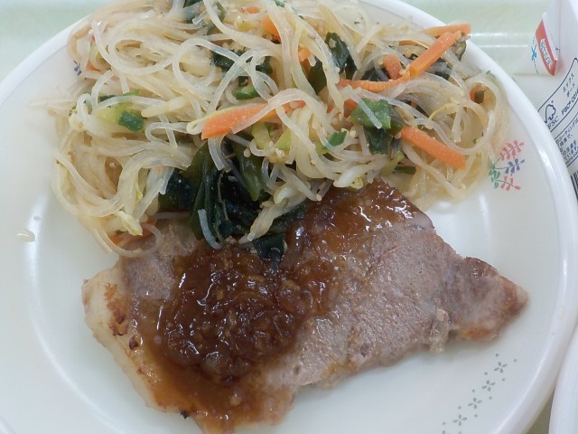 今日の給食 ごはん ぶた肩ロースのしょうが焼き はるさめサラダ みそけんちん汁 牛乳