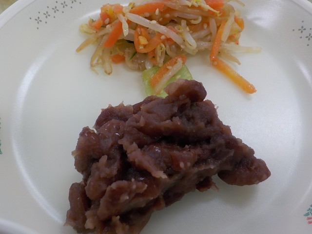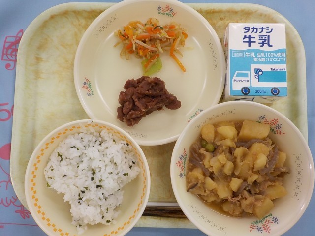 今日の給食 【6年生のリクエストメニュー:第9位】 わかめごはん きんとき豆の甘煮 野菜のごま酢あえ ピリ辛ツナじゃが 牛乳