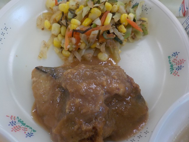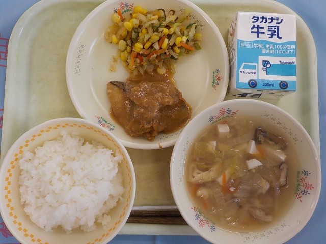 今日は6年生のリクエストメニュー第10位で、めし-1グランプリの「サラダ部門1位」にもえらばれた『元気サラダ』です。元気サラダは、「サラダでげんき」という絵本に出てくるメニューです。この本では、病気になったお母さんのために主人公のりっちゃんがサラダを作るおはなしです。このサラダを食べると元気になることができるので、みなさんもしっかりと食べてくださいね。今日の魚は「さば」です。『さばのみそ煮』はタレにつけたさばをオーブンで焼きタレを煮詰めなおしてさばの上にかけています。味がしっかりしているのでごはんが進みますね!