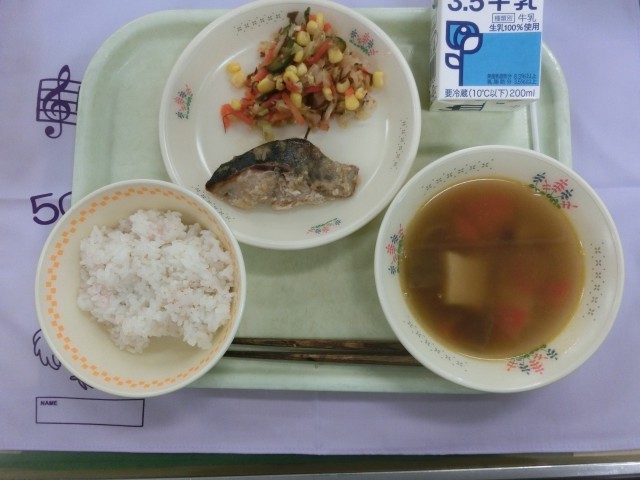 今日の給食 【進級お祝い献立】 さくらおこわ 魚の塩こうじ焼き 元気サラダ けんちん汁 牛乳