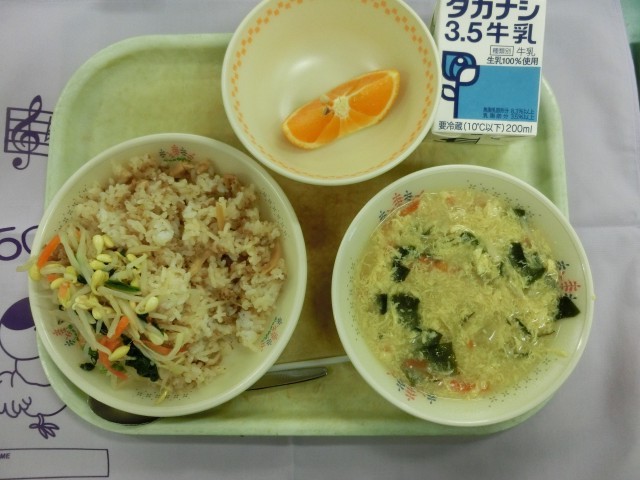 今日の給食 【食育の日:韓国料理】 ビビンバ トックとわかめのたまごスープ 清見オレンジ 牛乳