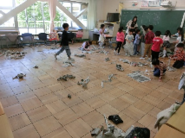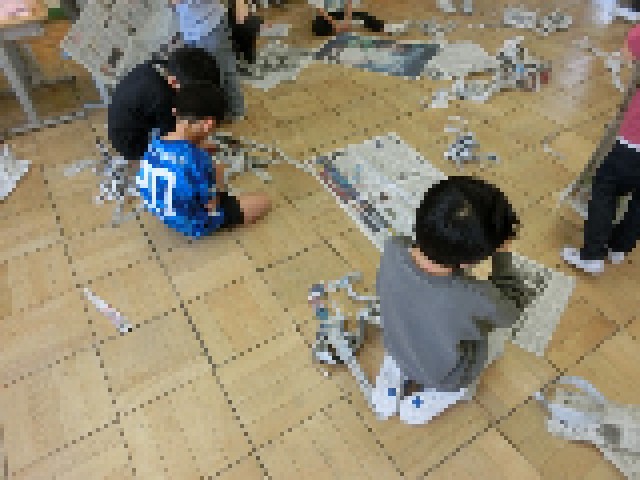 新聞紙を丸めたり、ちぎったり、張り付けたりしながら自分たちの思い描いた作品を作っていきます。「何を作っているの?」「飴玉を作ったよ。」「一緒に作ろう。」などなど、子供たちは楽しそうに自由な発想で活動をしていました。