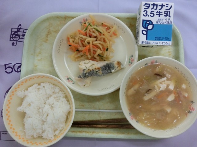 今日の給食 ごはん 魚のみそマヨ焼き じゃがいもの中華和え さわにわん 牛乳