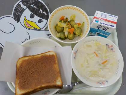 きなこトースト 春野菜のシチュー カレーピクルス 牛乳