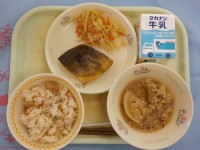 今日の給食 こぎつねごはん いかのねぎ塩焼き 青のり豆と粉ふきいも 吉野汁 牛乳