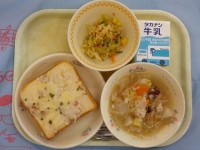 今日の給食 白いんげん豆のトースト プチっと玄米サラダ 肉団子と野菜の具沢山スー...