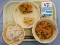 今日の給食 じゃこごはん いかのピリ辛焼き 野菜のごま酢あえ さといもととり肉の...
