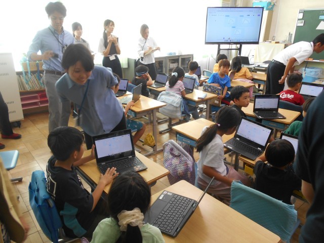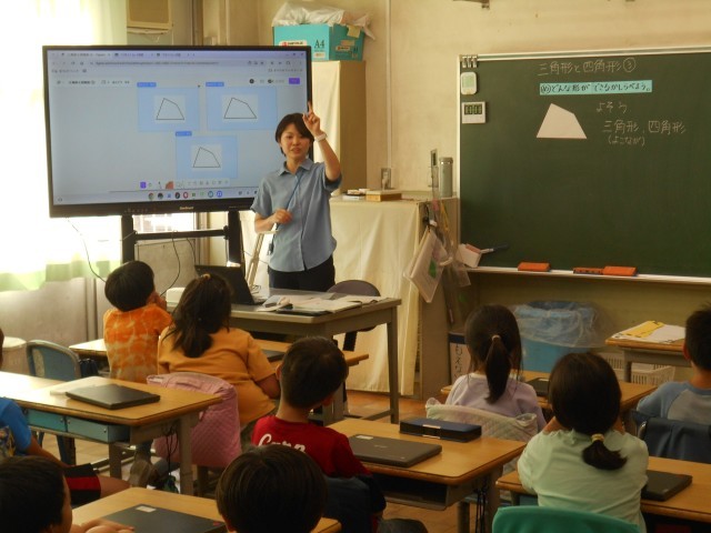 25日5時間目、2年2組教室にて算数の研究授業が行われました。単元は「三角形と四角形」。クロームブックでオンラインコラボレーションアプリFigjamを使い、子供たちが時に自分で、時にペアで学習に取り組む授業が展開されました。リズムとテンポが良い授業の中、子供たちは先生の話をよく聞き課題に意欲的にチャレンジしていました。