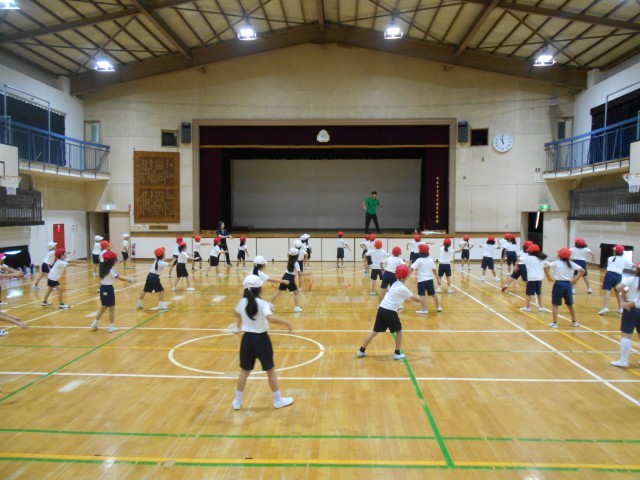 25日午前中、体育館にて1年生が合同体育を行いました。来月末に行われる運動会の表現運動の練習の時間でした。舞台上の先生の動きを真似ながら、一生懸命に体を動かすことができました。