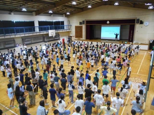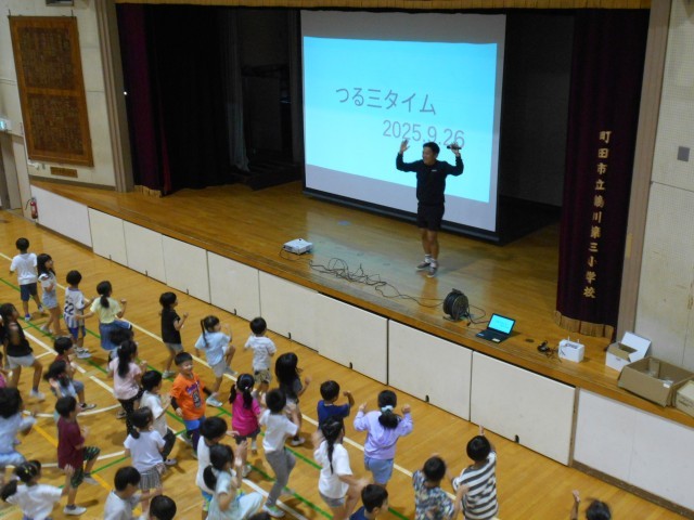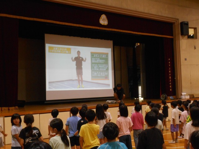 26日朝の時間、体育館にてつる三タイムが行われました。この日のテーマは「コオーディネーショントレーニング」。担当の教員が実際にやって見せ、子供たちがチャレンジし、周囲の教員たちも共に汗を流しました。後半の部では応用編が実践され、映像とともにさらに体を動かすことができました。
