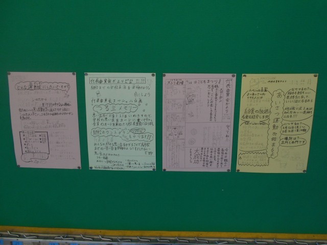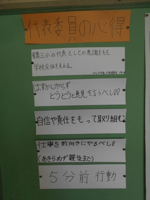 普段、児童会室にて休み時間集まることが多いようです。廊下には定期的に発行された児童会だよりが並び、室内には「代表委員会の心得」が掲示され、委員会活動に高い意識で臨んでいることが、伝わってきます。