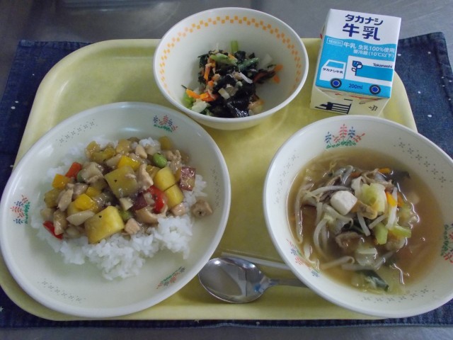 牛乳/根菜入りガパオライス/こまツナレモンサラダ/豆腐のスープ