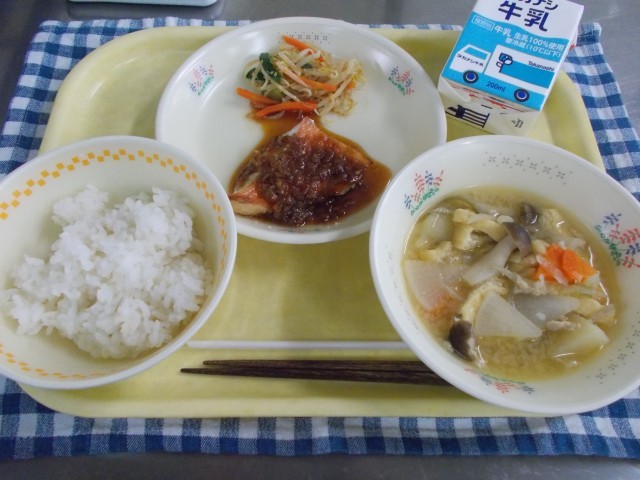 牛乳/麦ごはん/赤魚の香味焼き/もやしサラダ/豚汁