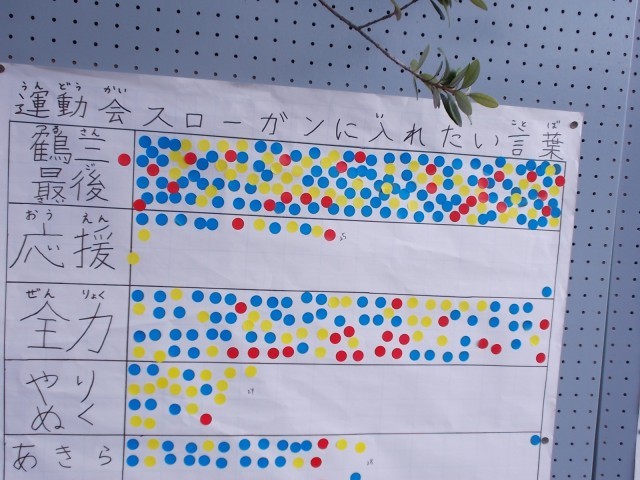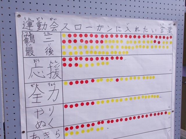 運動会当日まで、多くの係や委員会が準備に取り組んでいました。代表委員会では、スローガンに入れたい言葉をを全校から集め、まとめていました。2人の代表委員会児童の挨拶でも、スローガンに触れられていました。