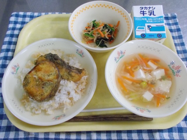 牛乳/二色天丼(さつまいも・魚)/おかか和え/あさり入りすまし汁