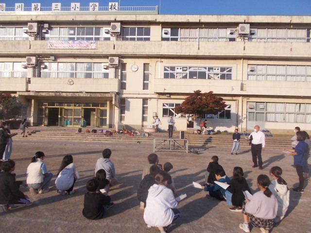 14日放課後、校庭にて「校歌校章お披露目会」のリハーサルが行われました。鶴四鶴三両校の6年生担当児童が集まり、顔合わせ。担当の先生の指導のもと、実際の会場になる校庭で本番と同じように話すことができました。どの子も用意してきた原稿をもとに、堂々と練習する姿が印象的です。