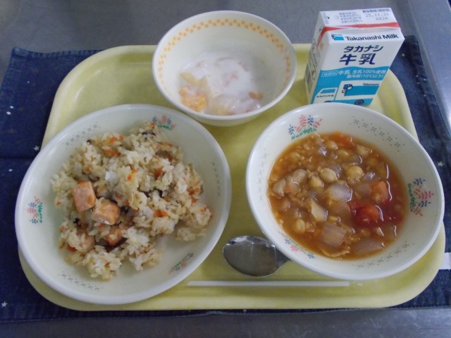 牛乳/五目鮭チャーハン/豆スープ/フルーツヨーグルト