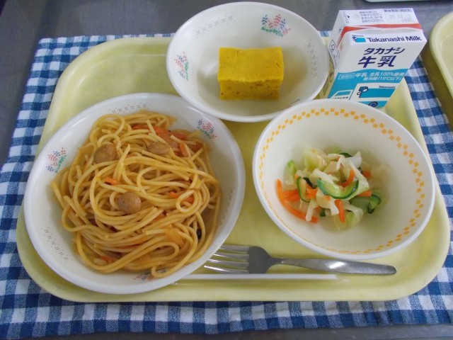 牛乳/スパゲティナポリタン/フレンチサラダ/かぼちゃケーキ