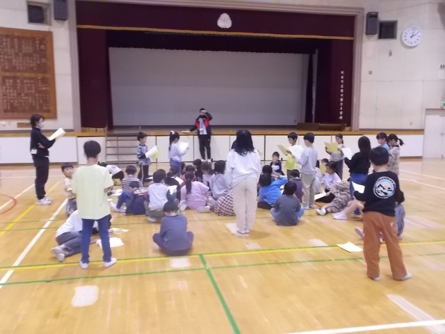 27日午前中、体育館にて2年生が学芸会の練習を行いました。台本の読み合わせを、学年合同で実施しました。お話の内容をみんなで追うことができました。
