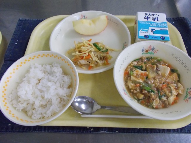 牛乳/麦ごはん/まち☆ベジ大根麻婆豆腐/ポテト入りナムル/りんご