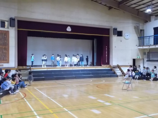 15日午後、体育館にて学芸会の練習が行われました。この日は全員での舞台練習。歌を歌う場面やみんなでセリフを合わせていう場面など、BGMをバックに演じる練習ができました。