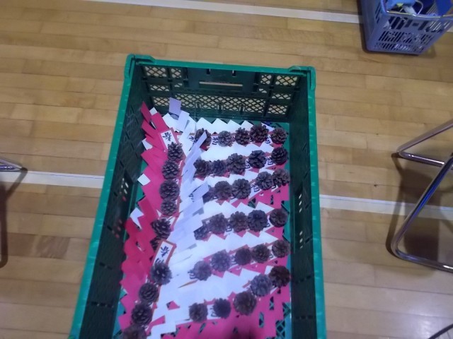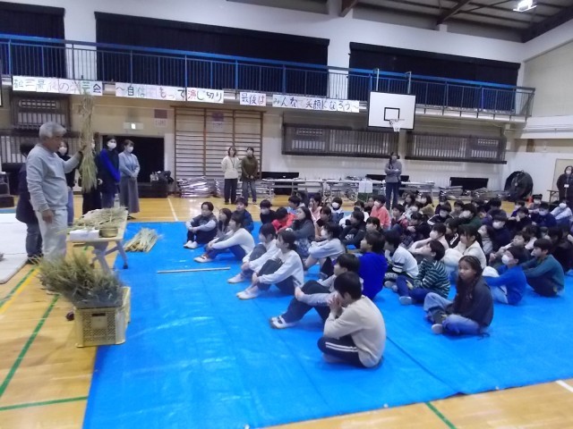 24日午前中、体育館にて鶴三小・鶴四小5年生が集まり、わら細工体験を通した交流会が行われました。地域協力者であり学校運営協議員の方々のご指導のもと、両校保護者のお手伝いボランティアの方々がサポートする形で子供たちはわら細工体験にチャレンジ。5つの工程があり、友達と協力しながら1人1つの作品を作ることができました。