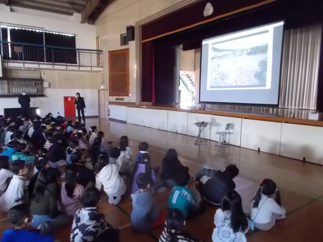 8日木曜日、体育館にて全校朝会が行われました。この日は校長先生から「鶴川中央小学校・鶴川東小学校(仮称)の校舎イメージ」の紹介がありました。写真スライドが大画面で表示されると、子供たちからは歓声が上がりました。