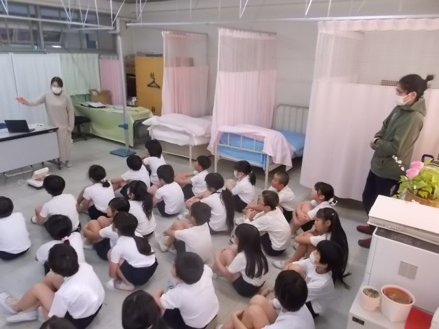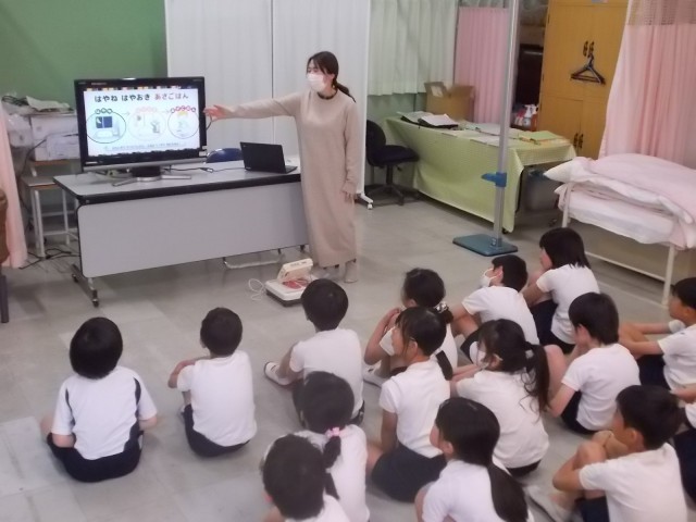 15日午前中、保健室にて3年2組が計測と保健指導&食育指導が行われました。食育指導では、朝ごはんの大切さについて栄養教諭から分かりやすい話がされました。