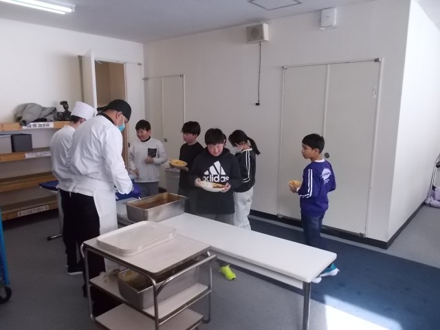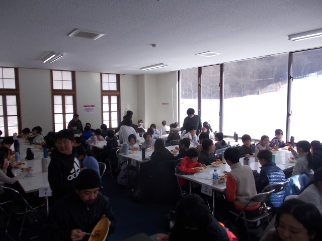 22日12時20分、昼食でハヤシライスを食べています。スキーの達成感からか、ハヤシライスを待つ子供たちは笑顔にあふれています。このあと学校に帰ります。