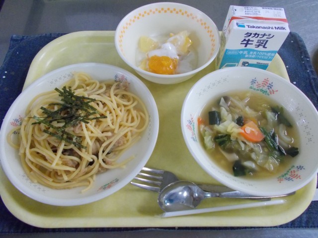 牛乳/ツナおろしスパゲッティ/野菜スープ/フルーツヨーグルト