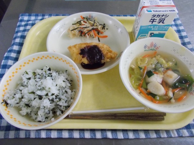 牛乳/わかめごはん(アルファ米)/魚のからあげ名古屋風みそだれ/シャキシャキ梅サラダ/お麩入りすまし汁