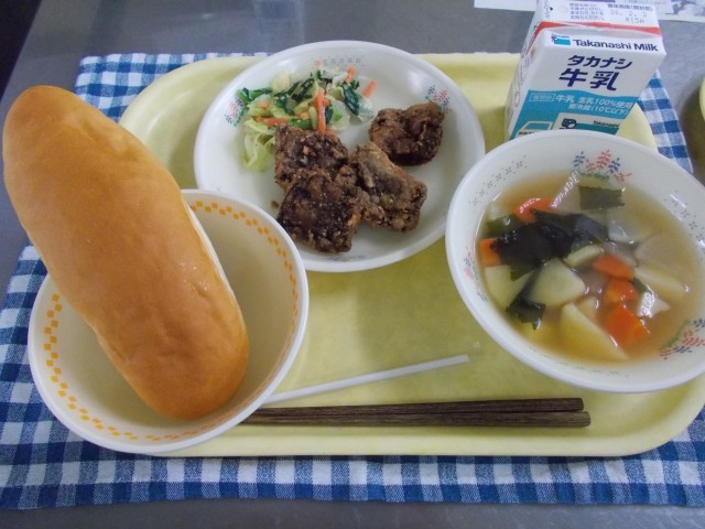 牛乳/コッペパン/くじらの竜田揚げ/野菜のマヨネーズ和え/野菜スープ